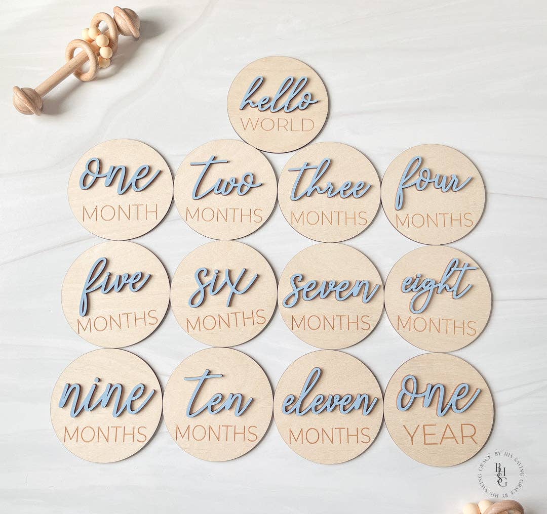 Our laser-cut and engraved circle wooden monthly milestone markers feature a natural disc and 3D vintage rose wooden letters.