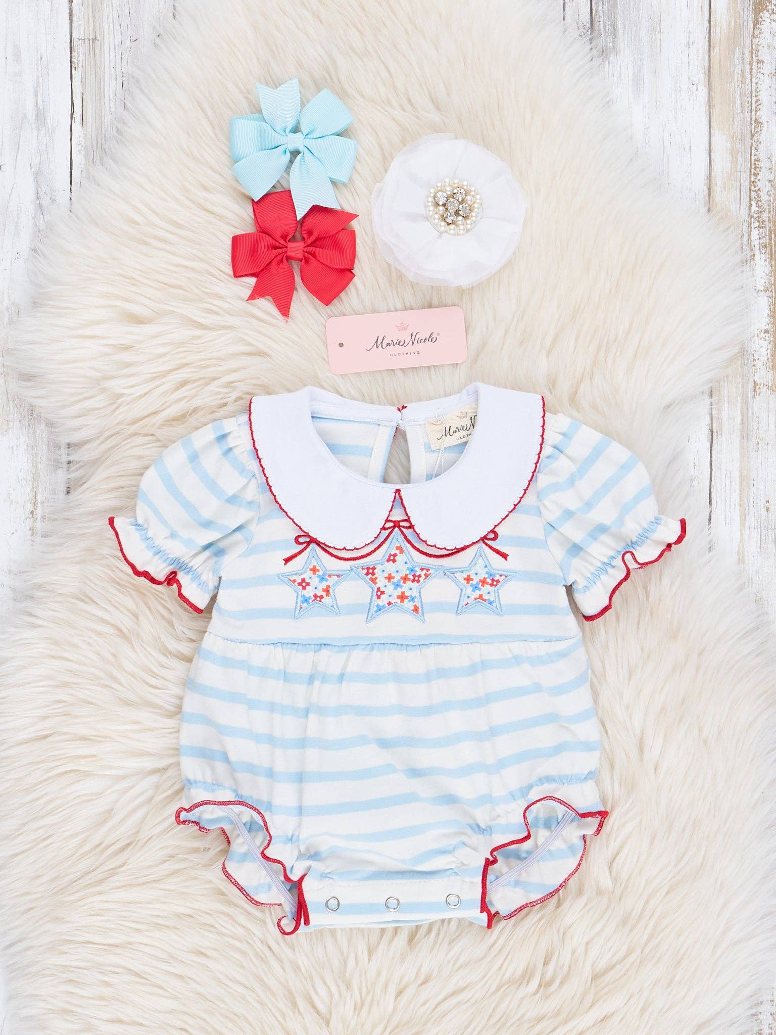 Rock the red, white, and blue with our Blue & White Striped Patriotic Stars Bubble! Featuring classic blue stripes, red trim, and a cute peter pan collar, this bubble is perfect for showing off your patriotic spirit.