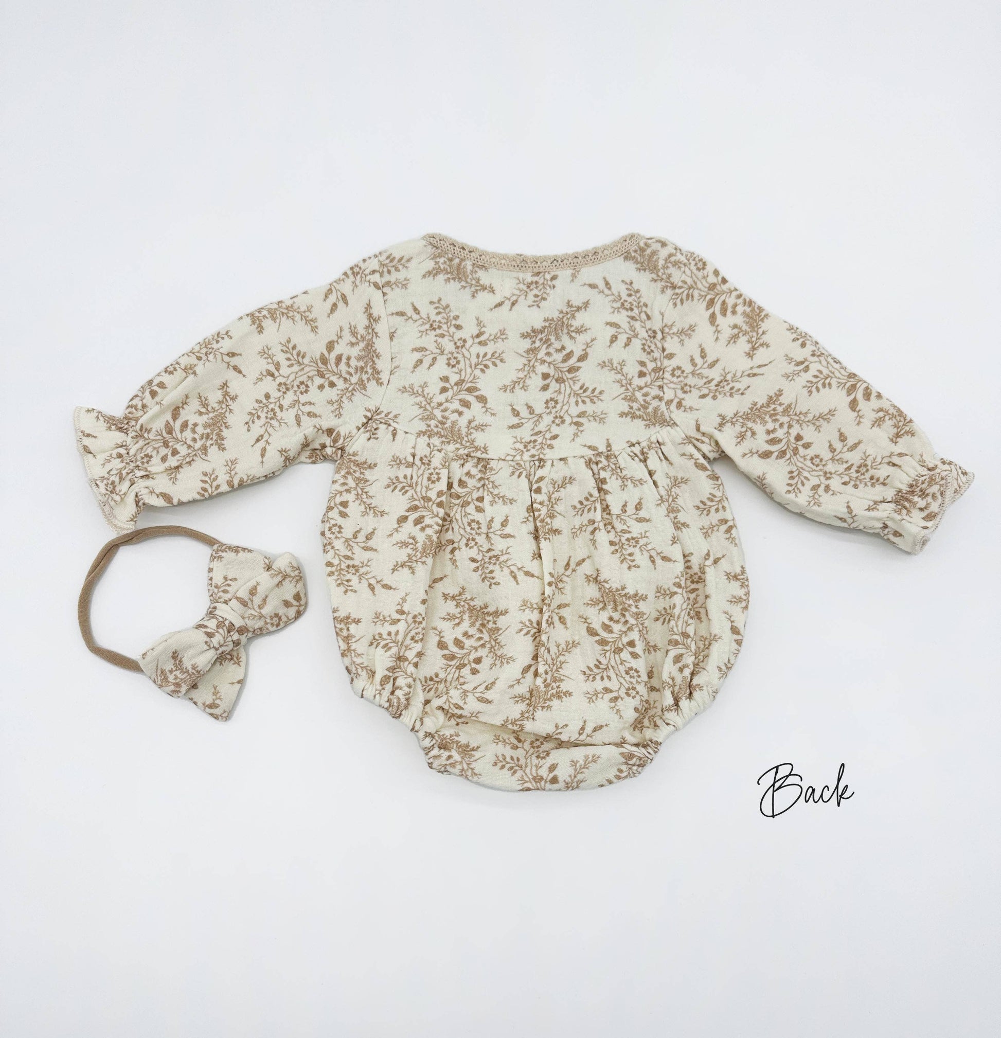 The Elodie romper blends timeless charm with vintage-inspired elegance, thoughtfully crafted from triple-layered 100% cotton muslin for exceptional softness and breathability. Featuring a neutral floral print, delicate lace trim, functional front buttons, and convenient snap closures for easy diaper changes, it offers both beauty and practicality. Ideal for spring, summer, or fall, the romper includes a matching bow.