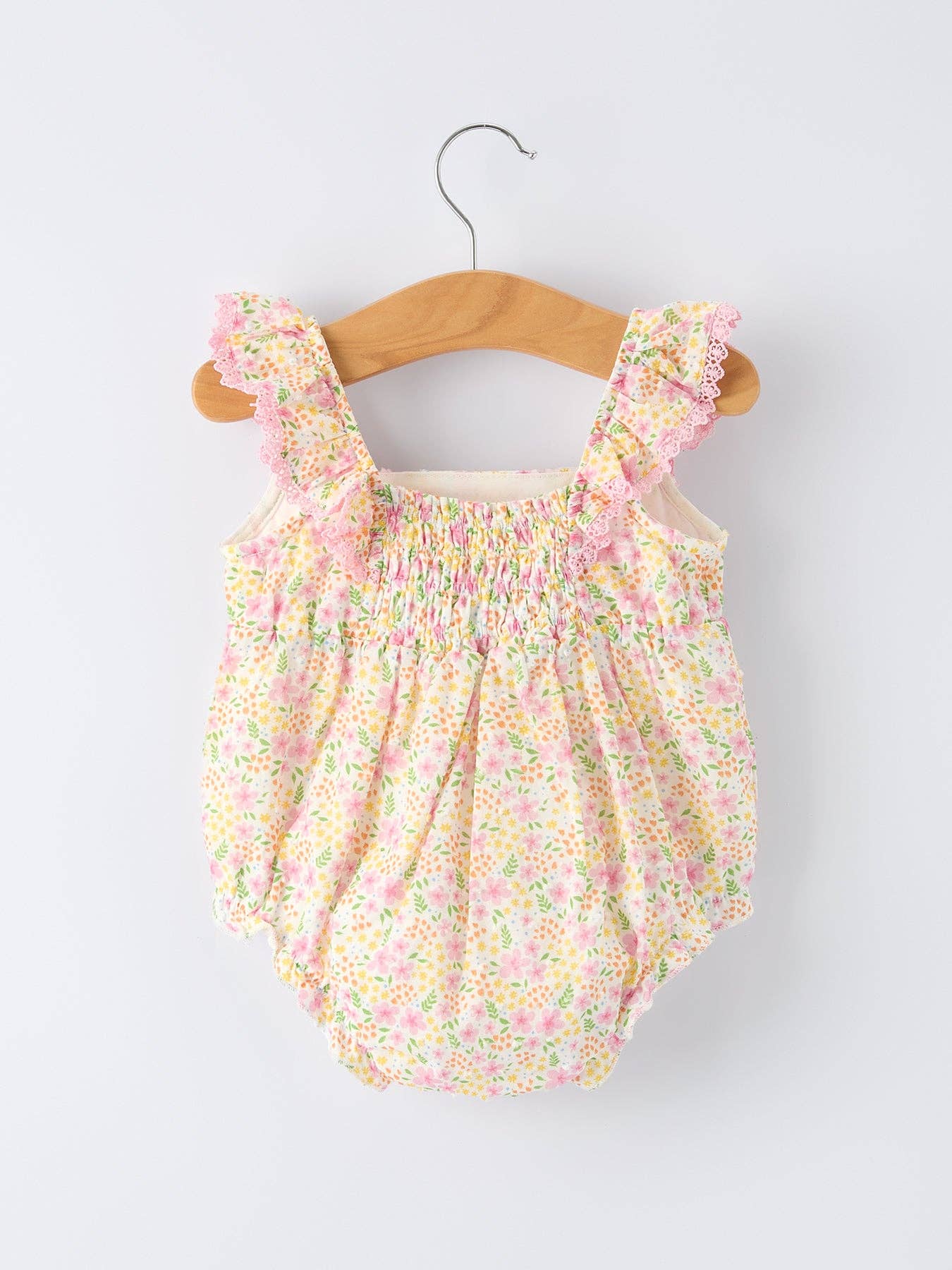 Twirl and play in effortless style with this charming floral romper. Delicate smocking at the bodice creates a flattering fit while ruffled details add movement and personality. The soft, breathable fabric keeps her comfortable all day long, whether she's exploring the playground or attending a special occasion. Perfect for spring adventures and summer celebrations, this versatile piece transitions seamlessly from casual outings to dressed-up moments. A wardrobe essential that captures childhood joy in every wear.