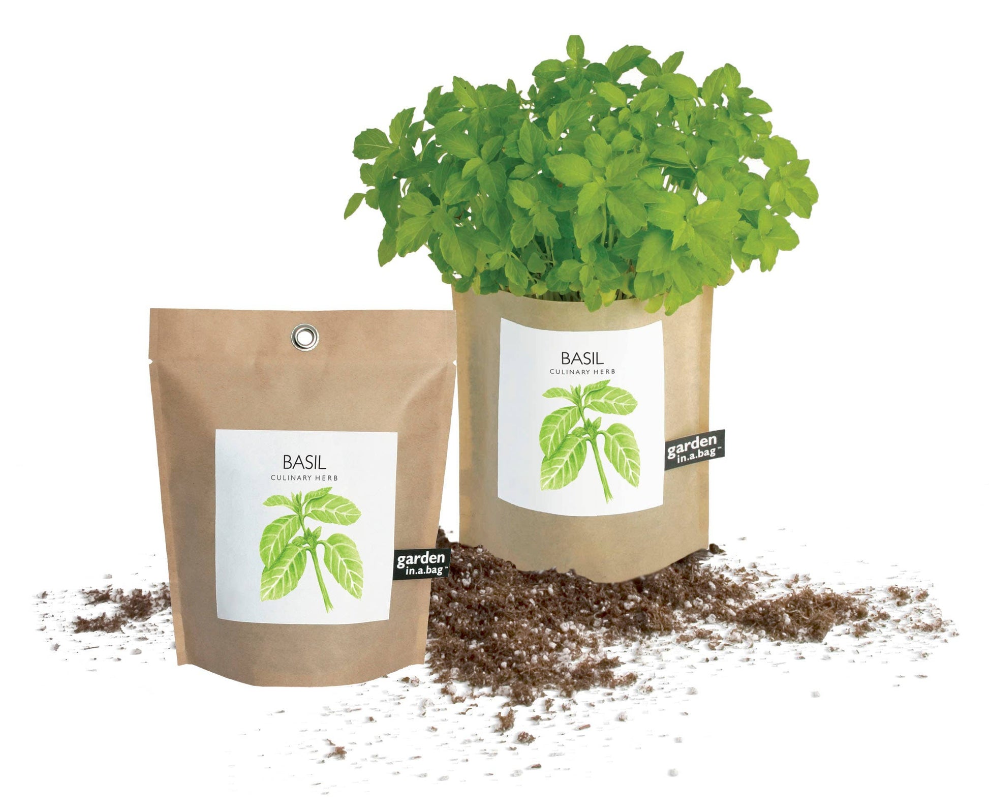 A complete garden kit containing everything needed to grow fresh Basil in a windowsill or any sunny spot indoors, year-round, directly in the leak-proof bag.