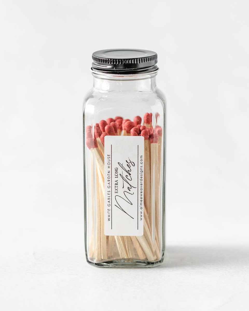 Our jar matches are a charming and practical addition to any home decor. This delightful jar comes filled with 40 extra long matches and has a black metal lid. With a convenient strike pad on the back of the jar, igniting candles or other fire-related tasks becomes a breeze.
