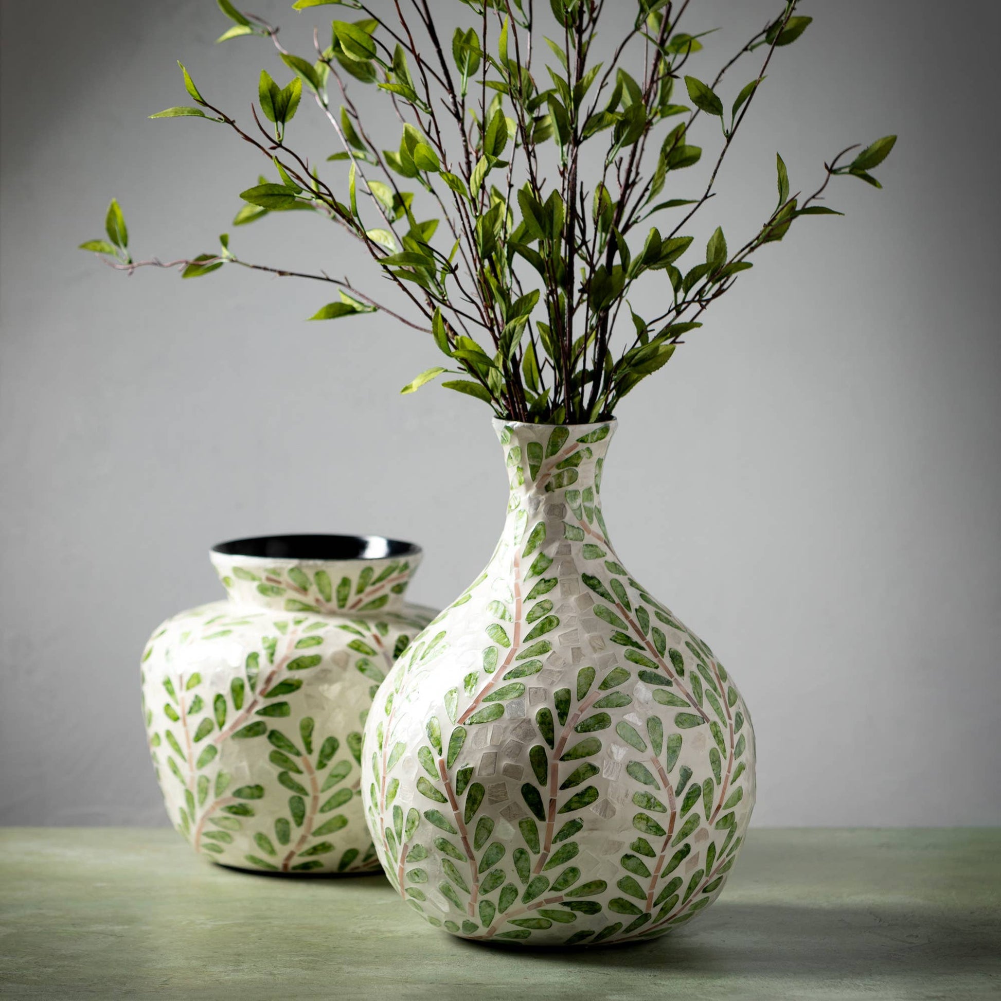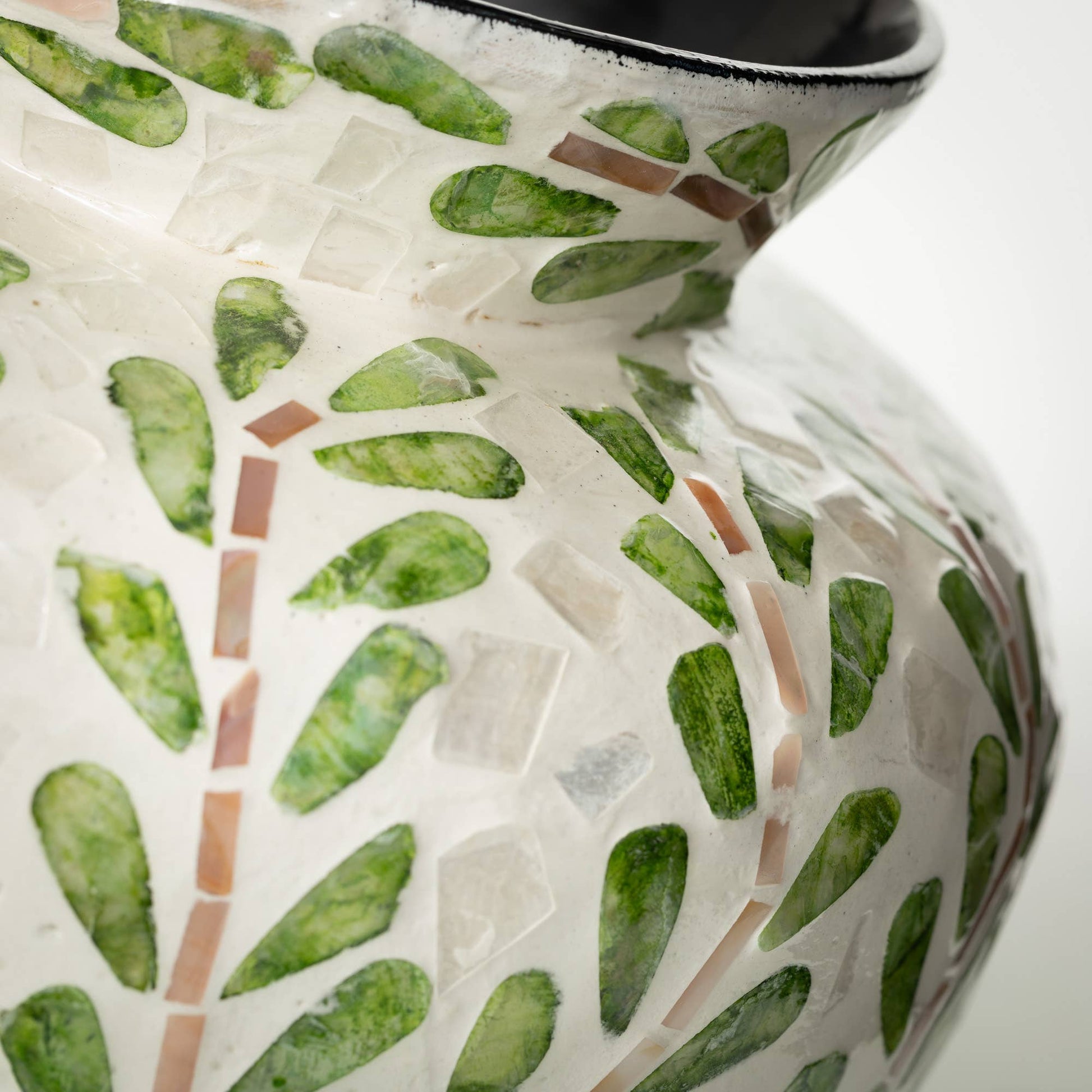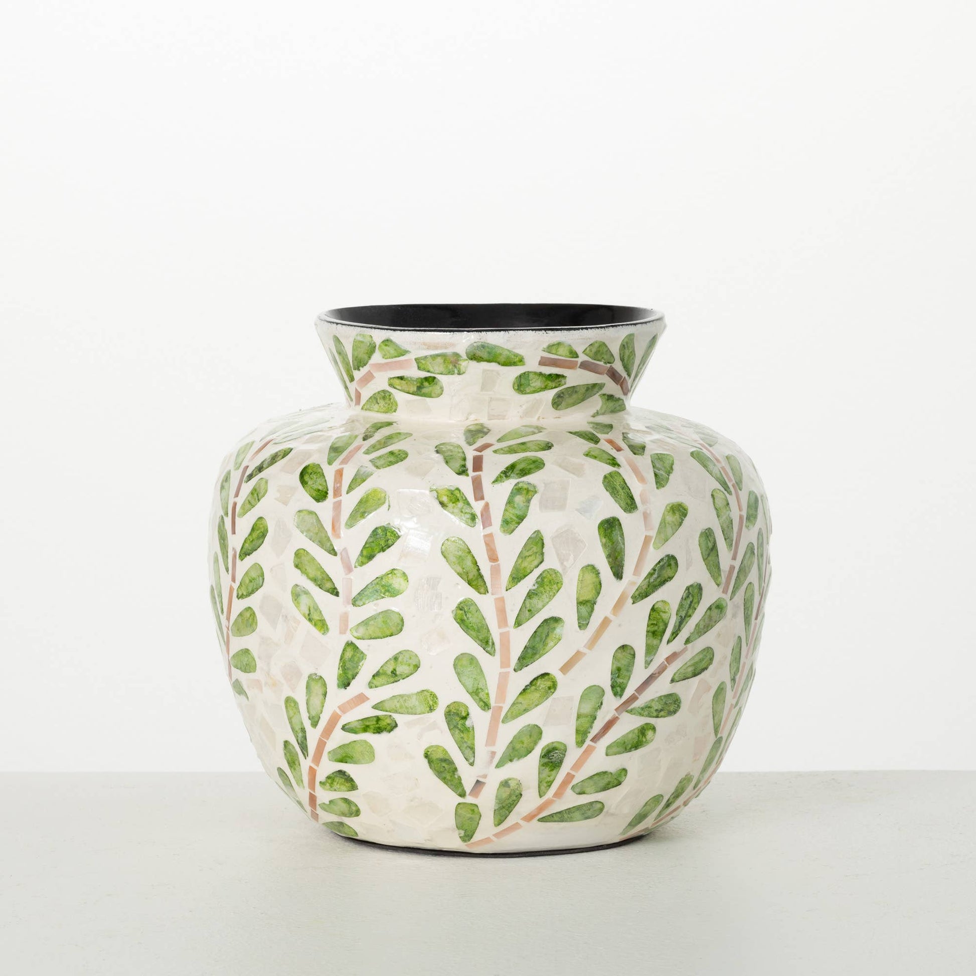 Bring the beauty of the outdoors in with this Leaf Pattern Bouquet Vase from Sullivans. Crafted with a soft green leaf pattern and an ivory background, this vase has a charming, natural look that complements any plant lover's decor. The contrasting color inside adds depth and dimension, while the bamboo and capiz blend gives it a high-end, artisanal feel. Fill it with fresh blooms and add a touch of botanical flair to your space. Its no-hole design makes it versatile for all your floral and greenery needs.