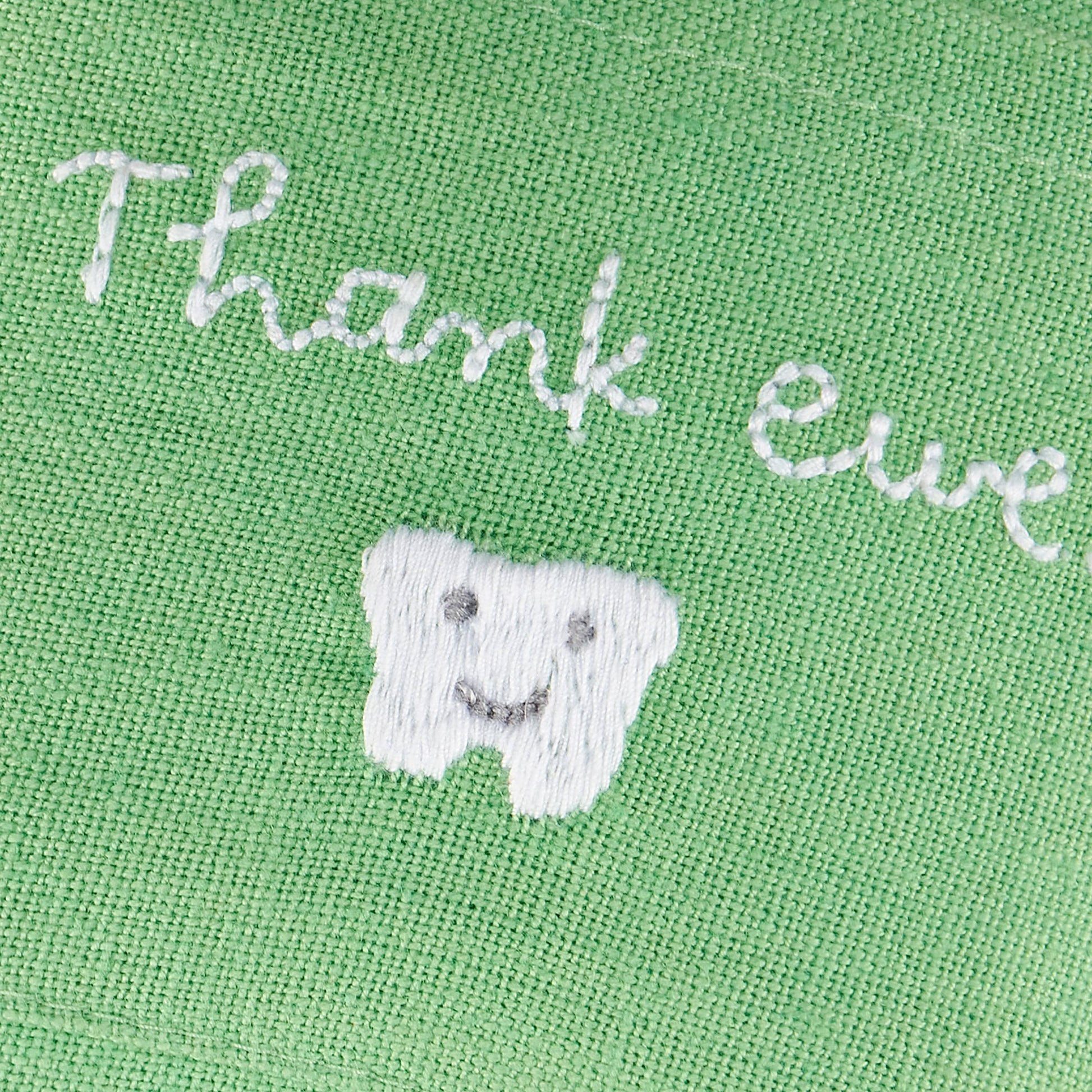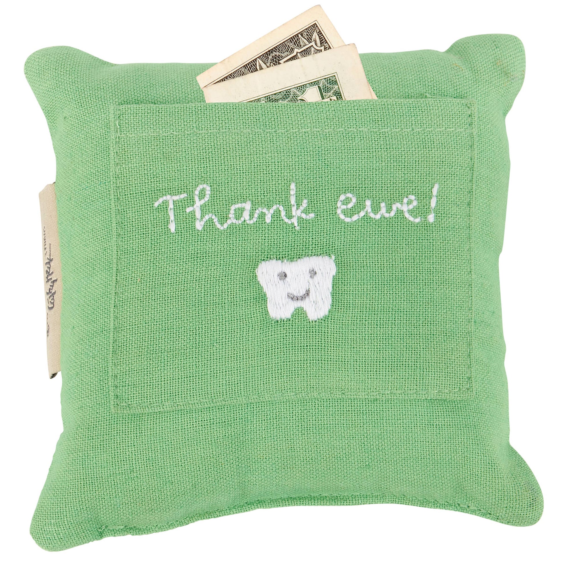 A cotton-linen blend pillow from our Baby & Kids Collection displaying a fun sheep design with "Dear Tooth Fairy - Please Stop Here" sentiment on the front. Tooth Fairy Pillow features pocket on the back to hold tooth or tooth fairy reward with a happy tooth design and "Thank Ewe!" sentiment. Designs and sentiments are embroidered for added interest. Contains polyester filling. Our Little Farm tooth fairy pillow is a charming farm-themed gift or keepsake.