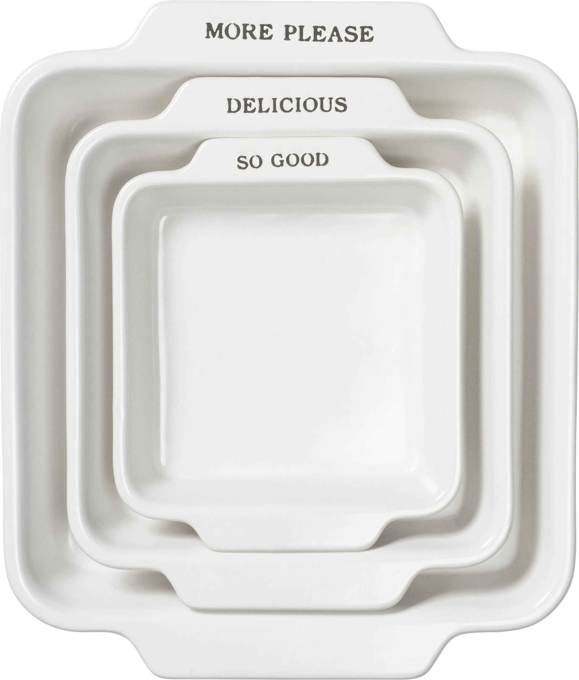 A set of three square stoneware serving dishes. Set includes a small, medium and large dish lending debossed "So Good," "Delicious" and "More Please" sentiments, respectively. White dishes display sentiments in slate gray across one handle of each dish. Features ribbed texture around body and flat, solid handles for easy carrying. Microwave, oven, dishwasher and food safe. This set makes a perfect addition to a farmhouse aesthetic and coordinates well with other pieces in collection!