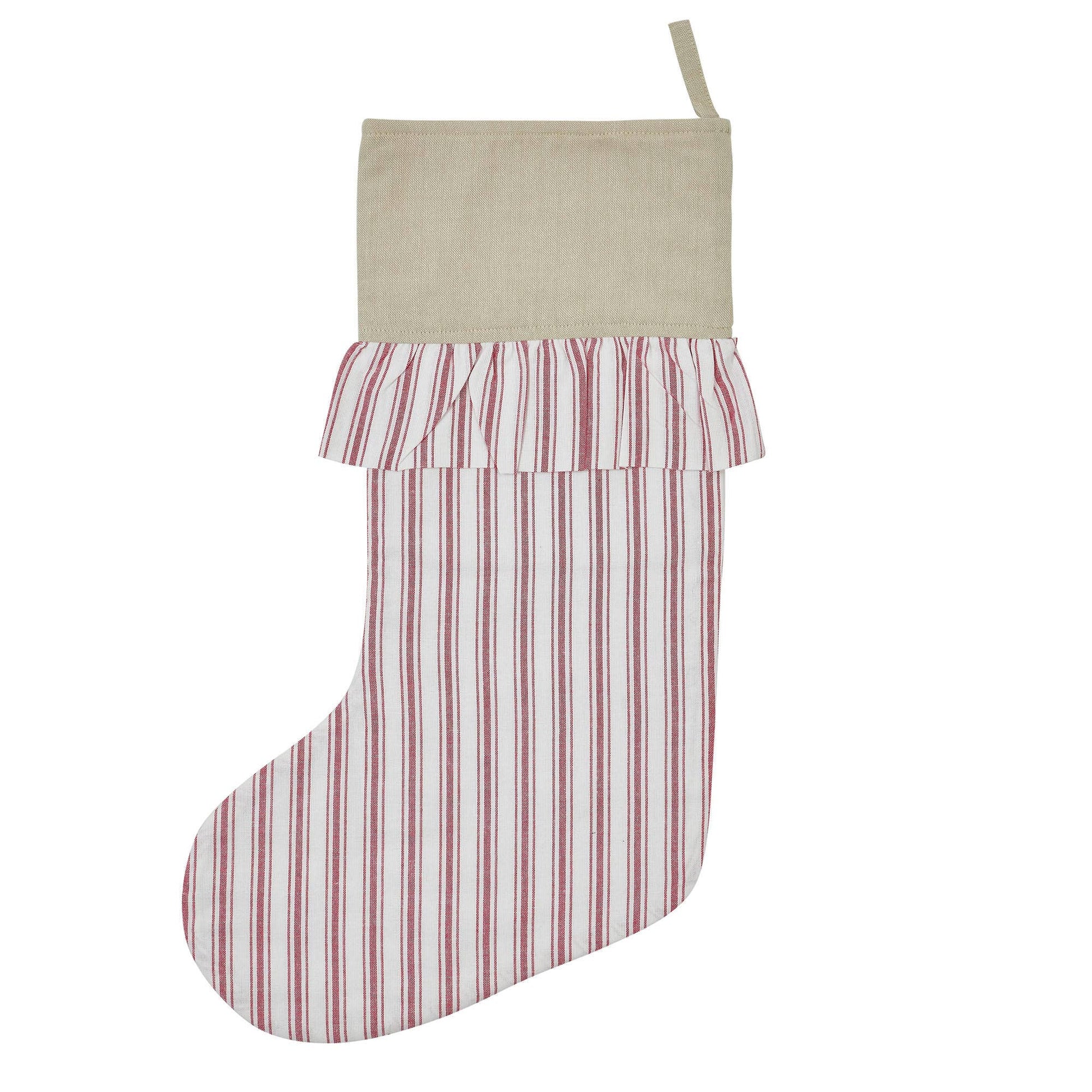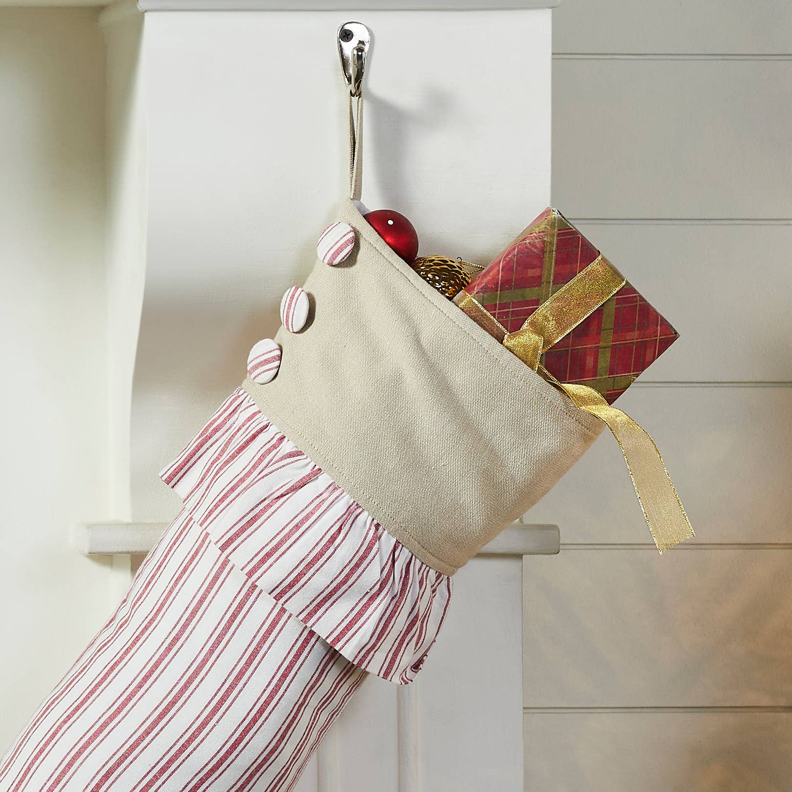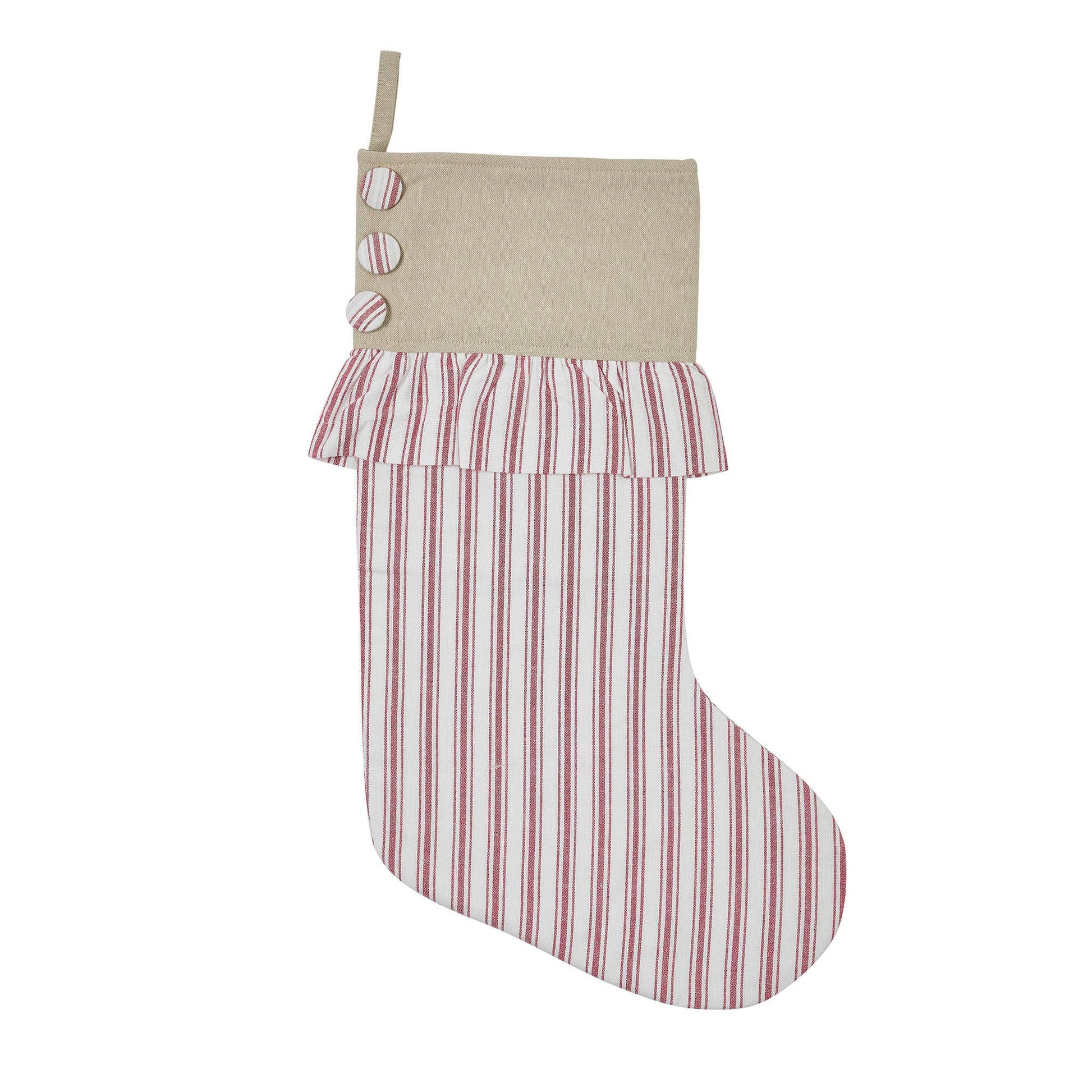 Remember the joy of Christmas morning? The timeless Ticking Red Stocking, a cozy blend of Sand, Apple Red, and Soft White hues, is here to help you recreate those cherished moments. This 20Lx12W stocking, handcrafted from 100% cotton, is a perfect addition to your holiday decor. Isn't it wonderful how the classic farmhouse and cottage styles blend seamlessly into modern living spaces? The charming Chambray texture, button details, and delicate ruffles add a touch of nostalgia to your Christmas hearth. And the best part? It's machine washable and iron safe, ready to shine year after year. on the back you'll find a delightful striped pattern in Red and Creme, a little surprise that keeps the holiday spirit alive. Ready to hang it by the fireplace? It comes with a fabric loop, just for that. Isn't it lovely how small details can make our holidays so much more memorable?